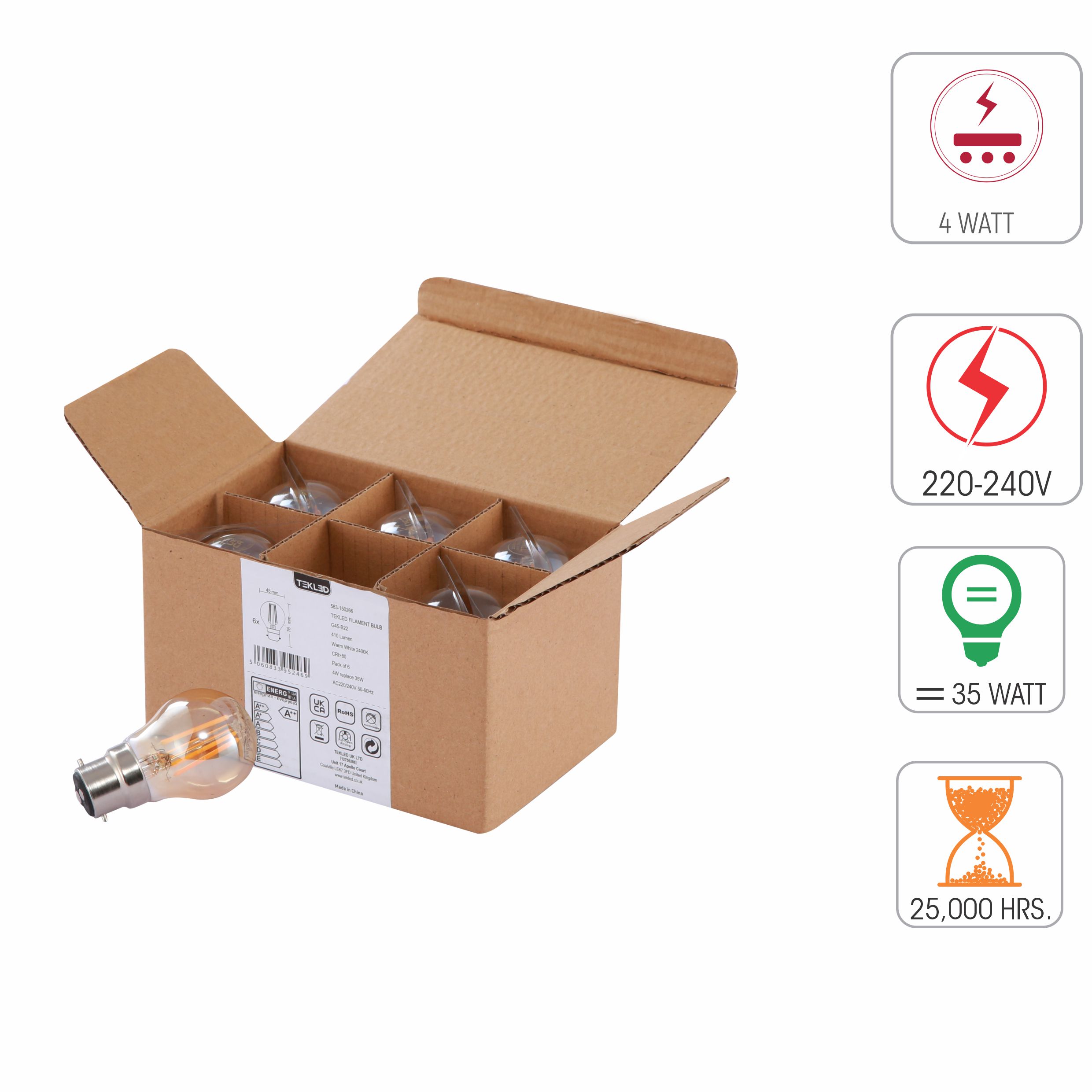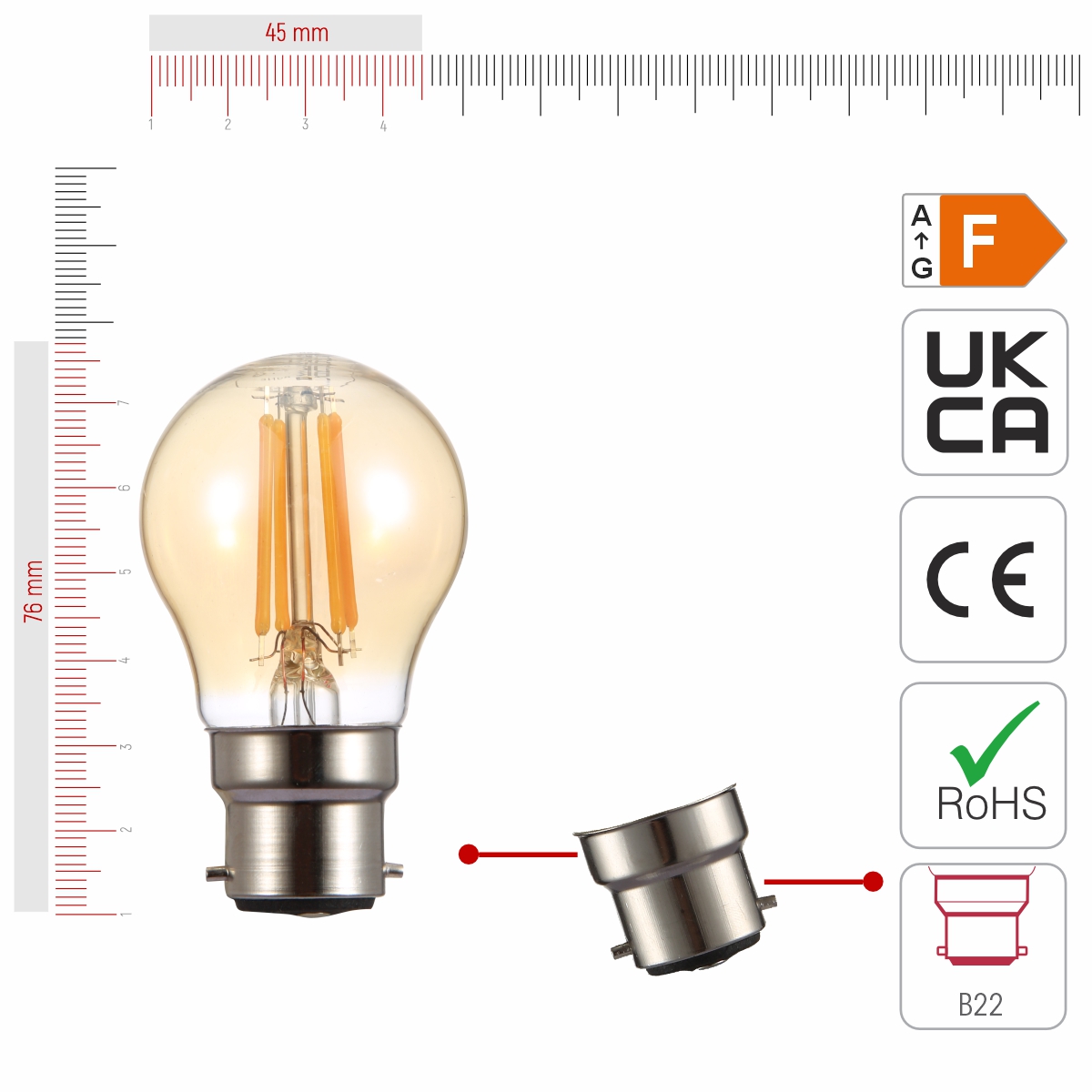 LED Fılament Bulb Golf Ball G45 B22 Bayonet Cap 4W 400LM Warm Whıte 2500K Amber Pack of 6