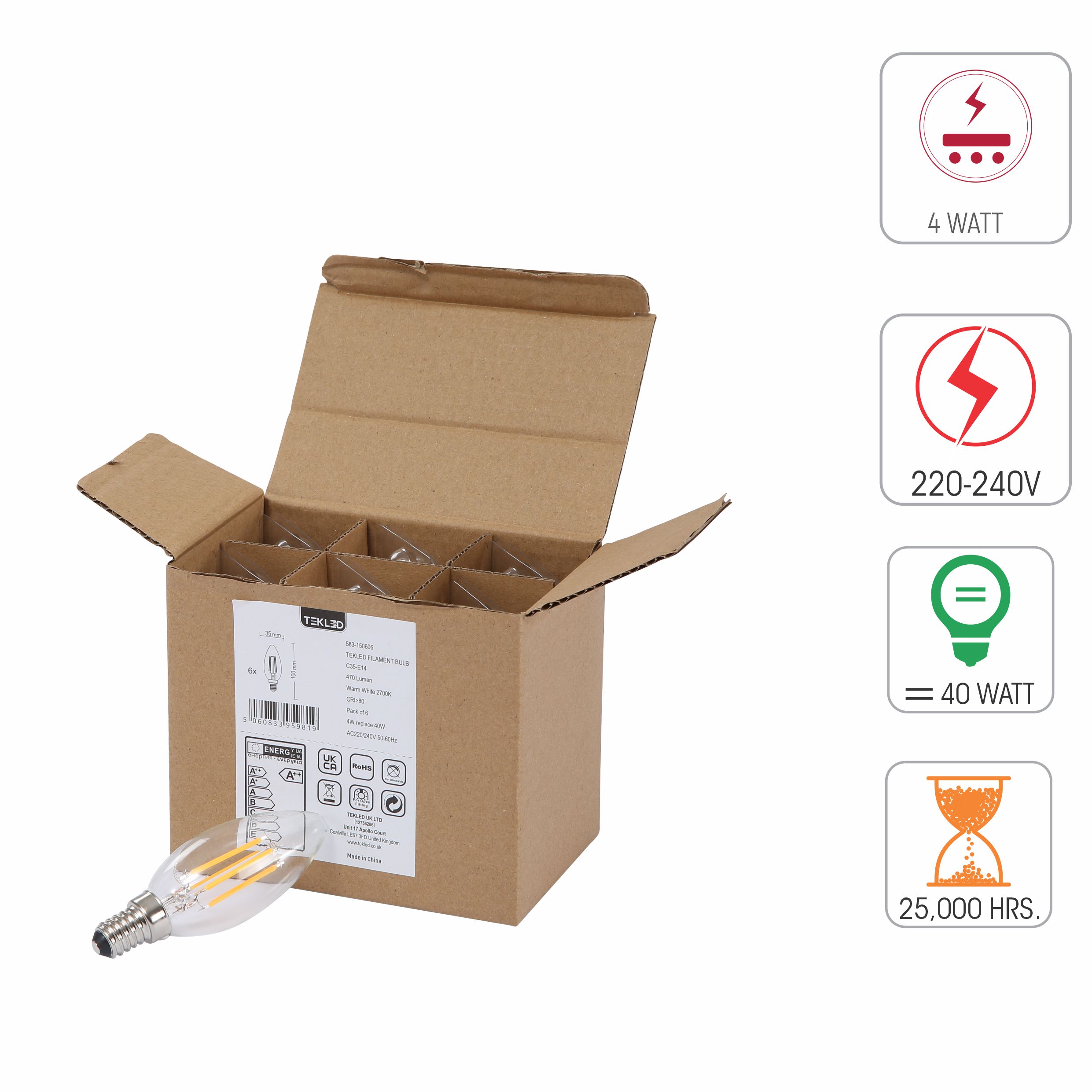 LED Fılament Bulb Candle C35 E14 Small Edıson Screw 4W 400LM Warm Whıte 2700K Clear Pack of 6