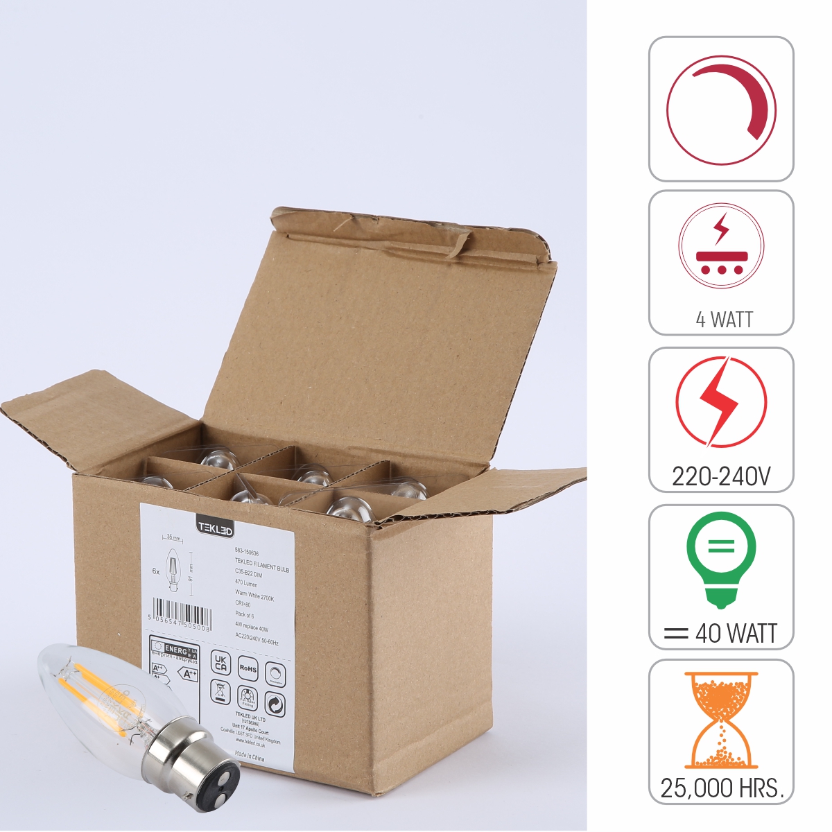 LED Dımmable Fılament Bulb C35 Candle B22 Bayonet Cap 4W 470lm Warm Whıte 2700K Clear Pack of 6